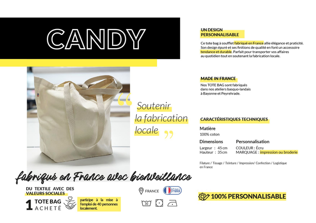 Choisissez un produit local, pratique et tendance : le Tote Bag Candy, l’accessoire qui fait la différence.